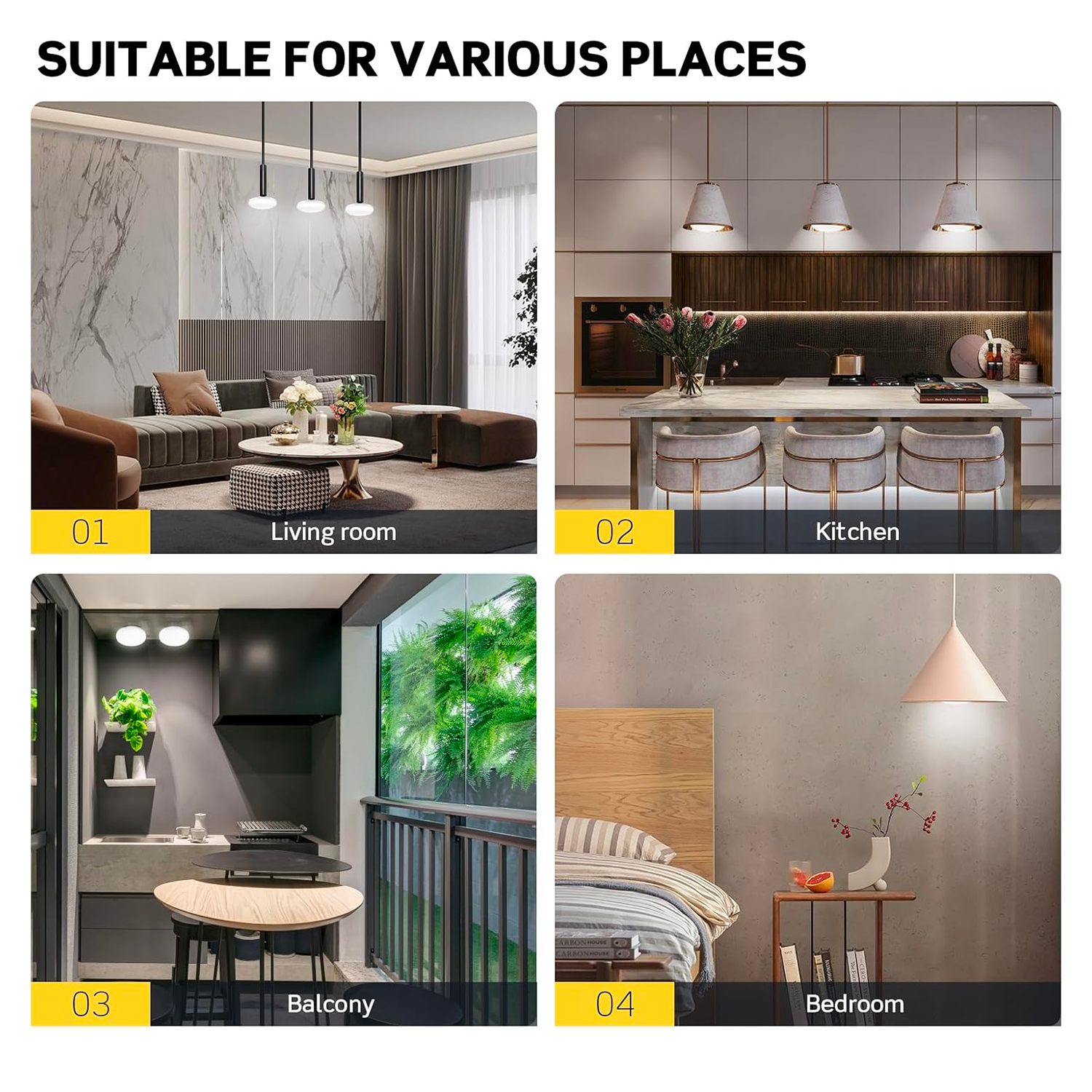 🏡 Living Room – Create a warm and inviting ambiance. 🍽 Kitchen – Brighten your cooking area with high-clarity lighting. 🌿 Balcony – Enhance outdoor spaces with energy-efficient illumination. 🛏 Bedroom – Provide a comfortable and cozy atmosphere.