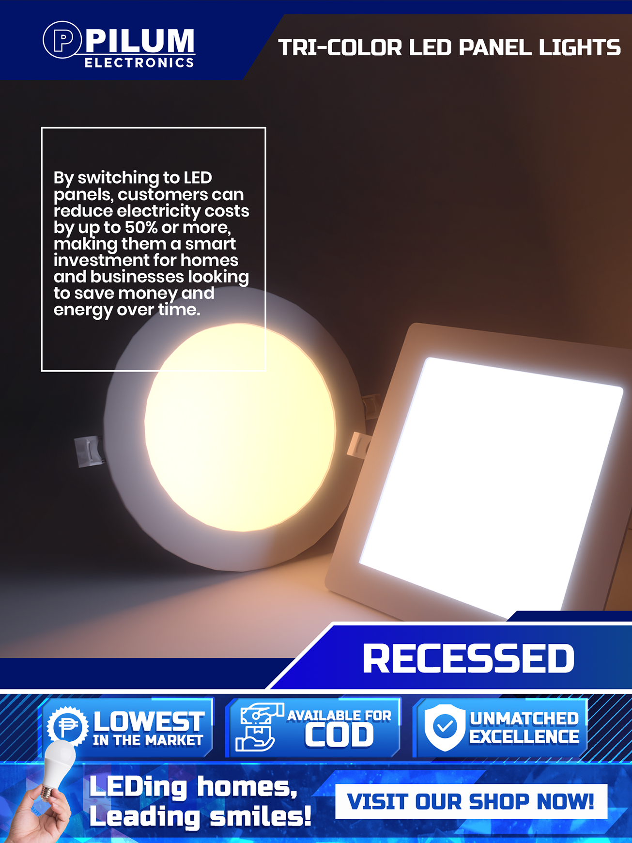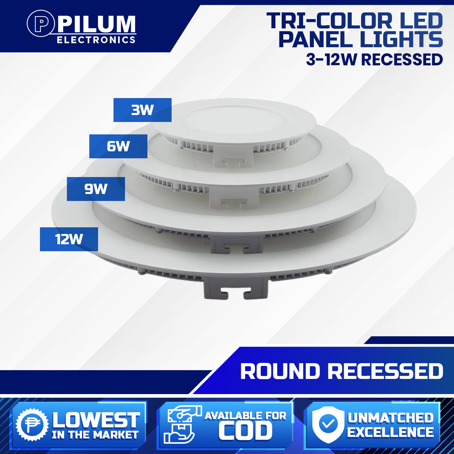 Brighten your space with smart, versatile lighting. The PILUM LED Tri-color Recessed Light is your perfect solution for modern, energy-efficient lighting. Available in 3W, 6W, 9W, and 12W options and sleek Round or Square designs, this light adapts to any interior – whether it's for your home, office, or commercial setting.